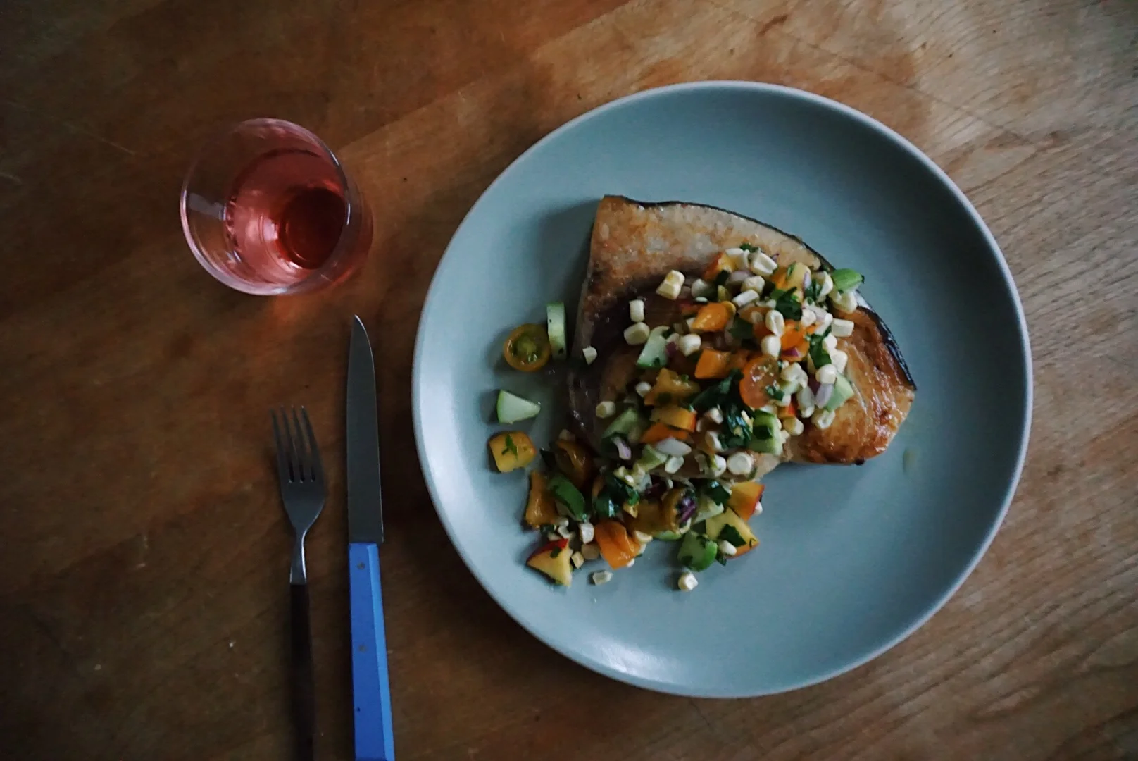 Make swordfish with nectarines and corn: Summer is for bright things, barely cooked. Get a great hunk of swordfish and sear it. On top, pile a salsa of chopped tomatoes, cucumbers, onion, and most importantly, tons of sweet corn and nectarine or peach, all drizzled with olive oil and lemon juice and plenty of salt. There's nothing more bright or satisfying, especially with a little splash of rose.
